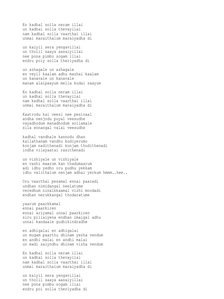 We always tries to present lyrics in very readable format and easy to find navigation bar. Please do share the song and lyrics with your dear ones if you like it. Idhu enna Ennul yedho vibaritham Idhu pola Aanadhu illai orupodhum Female.